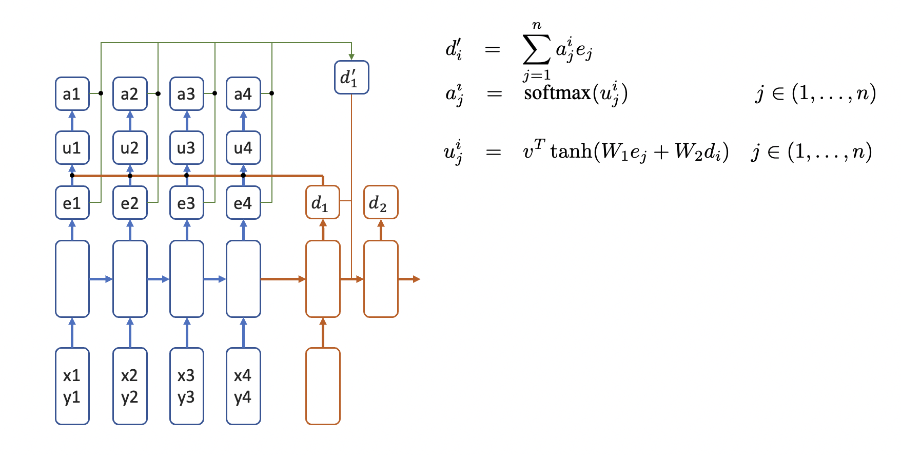 Pointer Network는 가중치 합을 계산하는 부분을 생략하고 softmax 값을 다음 output의 probability distribution로 취급합니다.