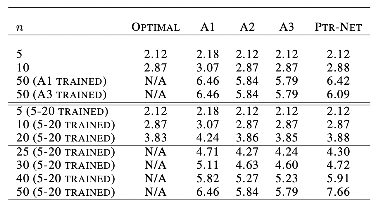 - A1 알고리즘으로 학습한 Pointer Network가 A1보다 더 좋은 성능을 보였습니다.